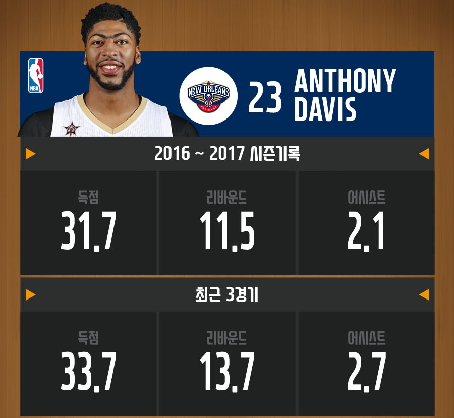데이비스는 뉴올리언스 3승 1패에 혁혁한 공을 세웠다. 평균 33.7득점 13.7리바운드 3.0블록 2.0스틸로 다방면에서 활약했다. 그는 포틀랜드, 샬럿 호네츠를 상대로 각각 38점을 쏟아부으며 시즌 평균 득점을 31.7득점까지 끌어올렸다(리그 1위). 데이비스는 포틀랜드전에 6어시스트, 그리고 샬럿전에 16리바운드를 잡아내는 등 득점에만 국한되지 않는 모습을 보이기도 했다.