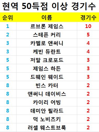 현역 중에서는 르브론 제임스가 10번을 기록, 1위에 올랐다. 10회는 역대 7위에 해당하는 기록이기도 하다. 아직 현역이지만, 또 다시 50점 이상을 올릴 가능성은 낮은 편이다. 전성기에서 서서히 내려오고 있는 데다가 득점보다는 경기운영에 초점을 맞추는 플레이스타일로 바뀌었기 때문이다.