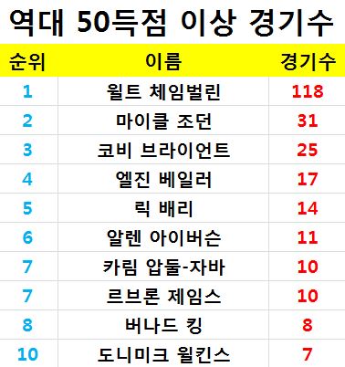 영광의 1위는 '신화적 존재' 윌트 체임벌린이다. 커리어 동안 무려 118번이나 50점 이상 경기를 치렀다. 단연 압도적인 기록. 1961-62시즌에는 평균 50.4점 25.7리바운드라는 전설적인 시즌을 보내기도 했다.