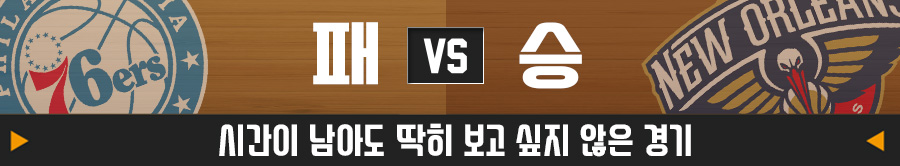 두 팀 모두 부상자가 너무 많다. 뉴올리언스 펠리컨스는 즈루 할러데이(발가락)와 이트완 무어(발가락)가 결장할 가능성이 높아 보인다. 타이릭 에반스(무릎, 종아리)는 복귀까지 아직 시간이 더 남았다. 필라델피아 76ers에서는 로버트 코빙턴(무릎), 널렌스 노엘(무릎), 자힐 오카포(위장염)가 결장한다. 두 팀 모두 제 전력이 아니라는 뜻. 조엘 엠비드와 앤써니 데이비스의 대결이 유일한 볼거리다. 그런데 식서스는 아직까지 원정(0승 7패)에서 한 번도 이기지 못했다. 졸전 끝에 펠리컨스가 신승할 것으로 보인다.