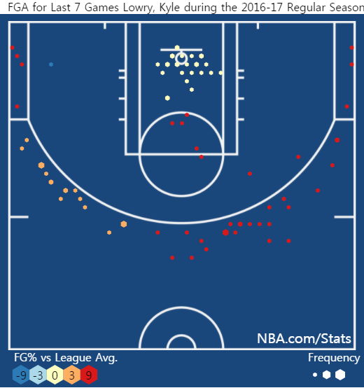 다음은 NBA.com/stats이 제공하는 라우리의 최근 7경기 슛 차트다. 외곽슛 감각이 매우 뜨거움을 알 수 있다.