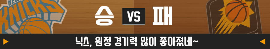 뉴욕 닉스는 최근 원정경기 4연승에 성공했다. 원정만 가면 공수 경기력이 널을 뛰었던 시즌 초반과는 확실히 달라진 모양새다. 또, 최근 서부 컨퍼런스 팀들을 상대로 5연승을 달리고 있다. 벤치 리더 브랜든 제닝스가 살아난 것이 큰 보탬이 되고 있다. 피닉스 선즈는 최근 다섯 경기에서 1승에 그쳤다. 경기력이 좀처럼 안정되지 못하고 있다. 가드진의 기복이 심하고 프런트 코트의 득점력이 떨어진다. 홈에서조차 3승 7패에 그치고 있다. 또, 지난 5경기에서 무려 118.8점(!)이나 실점하는 등 수비가 전혀 안 된다. 갑자기 개선될 리 만무하다.