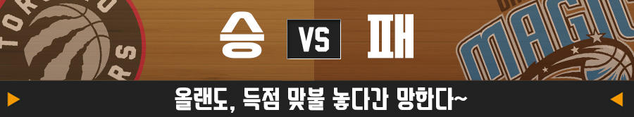 잘나가던 토론토 랩터스가 17일 애틀랜타 호크스에 일격을 당했다. 리바운드 싸움에서 완패했기 때문이었다. 그러나 최근 12경기에서 10승을 올리는 등 분위기는 여전히 좋다. 올랜도 매직은 최근 수비력이 많이 약해진 상태다. 이를 공격력 강화를 통해 만회하고 있다. 그러나 상대는 NBA 70년 역사상 공격 효율성 1위를 기록 중인 토론토다. 득점 대결로 나가서는 랩터스를 이길 수 없다. 시즌 초반 보여준 강력한 수비를 회복하지 않는 한, 올랜도의 승리는 없을 것이다.