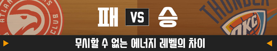 오클라호마시티 썬더는 높은 에너지 레벨을 기반으로 날뛰는 팀이다. 애틀랜타 호크스는 정교한 세트 오펜스를 바탕으로 한 안정적인 경기운영이 돋보이는 팀이다. 서로 상극이라는 얘기다. 시즌 첫 번째 맞대결은 애틀랜타에서 열렸는데, 당시 썬더가 102-99로 신승한 바 있다.