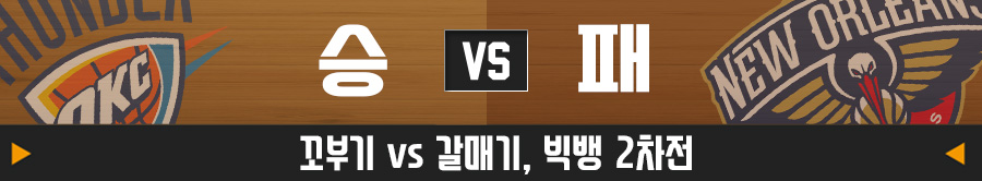 어느 팀이 이겨도 이상하지 않은 경기. 양 팀 모두 하락세가 뚜렷하다. 오클라호마시티 썬더는 빅터 올라디포(손목)의 이탈 이후 1승 3패를 기록 중이다. 뉴올리언스 펠리컨스는 항상 부진해서 새삼스러울 것도 없다. 결국 러셀 웨스트브룩과 앤써니 데이비스의 '원맨쇼'에 기대야 한다. 지난 두 시즌 동안, 썬더는 웨스트브룩이 트리플-더블을 기록한 경기에서 28승 3패를 올렸다. 최근 웨스트브룩의 컨디션은 매우 좋은 편. 펠리컨스는 이틀 연속 경기인 점이 부담스럽다.