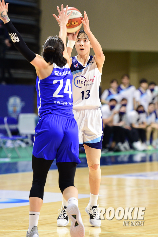 20일 이순신빙상장체육관에서 '삼성생명 2021~2022 여자프로농구’ 아산 우리은행과 인천 신한은행의 경기가 열렸다. 신한은행 김단비가 3점슛을 시도하고 있다.
