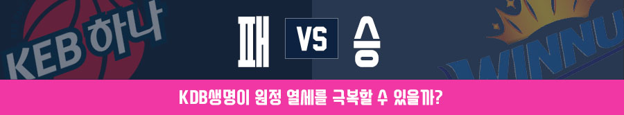 KEB하나은행과 KDB생명의 현재 분위기는 정반대다. 최근 5경기 1승 4패로 떨어진 KEB와 3승 2패를 기록 중인 KDB다. 리그 3위로 처진 KEB가 오늘 경기까지 패배한다면 2위 삼성생명과의 격차가 벌어지게 된다.