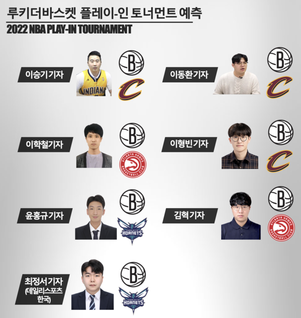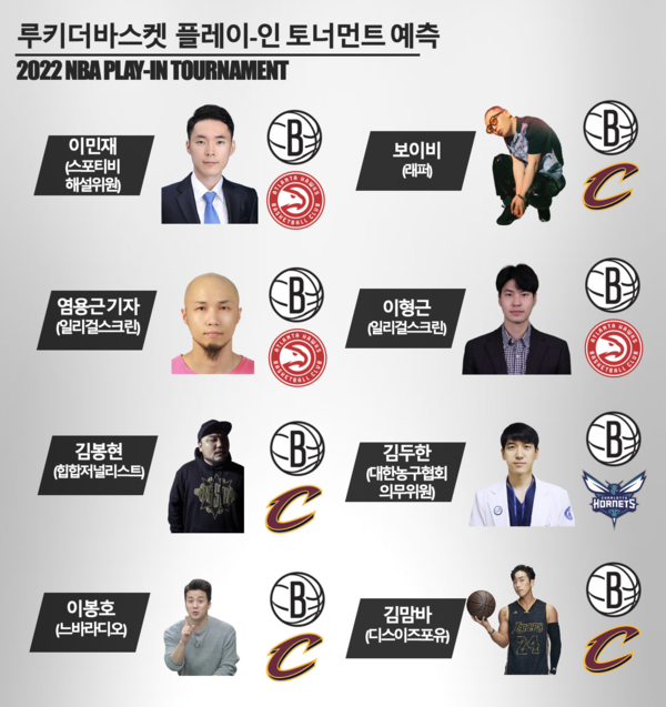 이민재 해설위원, 염용근 기자 등 5명은 애틀랜타를, 래퍼 보이비, 김봉현 힙합 저널리스트 등 7명은 클리블랜드가 8번 시드를 차지할 것으로 내다봤다. 김두한 대한농구협회 의무의원, 최정서 기자, 윤홍규 기자는 샬럿의 8번 시드행을 예상해 눈길을 끌었다.