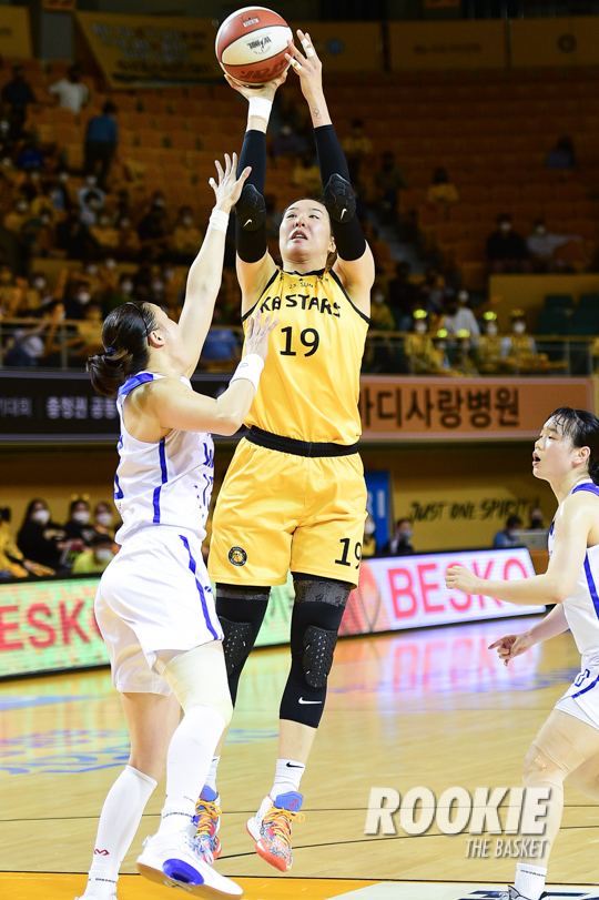 12일 청주실내체육관에서 '삼성생명 2021~2022 여자프로농구’ 청주 KB스타즈와 아산 우리은행의 챔프전 2차전 경기가 열렸다. KB스타즈 박지수가 슛을 시도하고 있다.