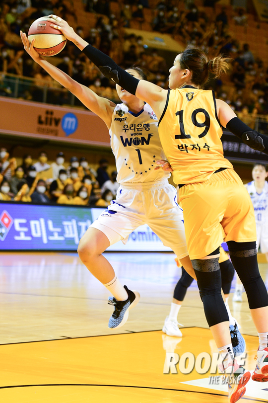 12일 청주실내체육관에서 '삼성생명 2021~2022 여자프로농구’ 청주 KB스타즈와 아산 우리은행의 챔프전 2차전 경기가 열렸다. KB스타즈 박지수가 상대의 슛을 블록하고 있다.