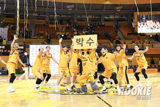 12일 청주실내체육관에서 '삼성생명 2021~2022 여자프로농구’ 청주 KB스타즈와 아산 우리은행의 챔프전 2차전 경기가 열렸다. KB스타즈가 80:73으로 승리하였으며, 선수들이 춤을 추며 팬들과 승리의 기쁨을 나누고 있다.