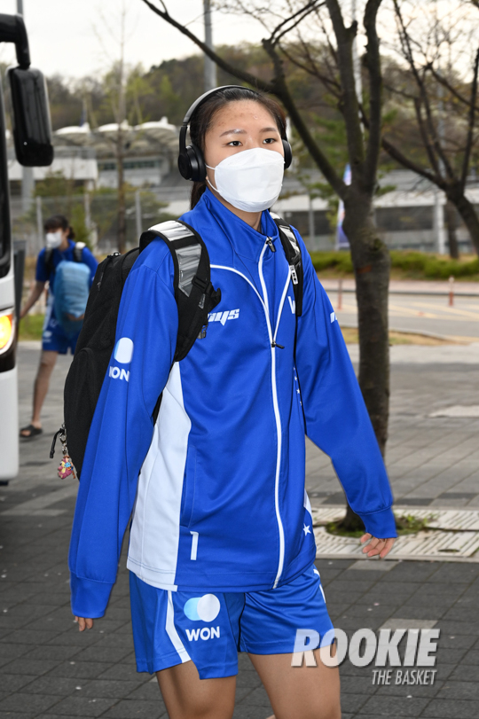 14일 이순신빙상장체육관에서 '삼성생명 2021~2022 여자프로농구’ 아산 우리은행과 청주 KB스타즈의 챔피언결정전 3차전 경기가 열렸다. 우리은행 박지현이 경기장에 들어오고 있다.