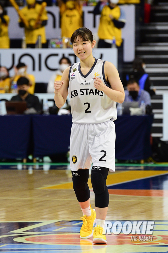 14일 이순신빙상장체육관에서 '삼성생명 2021~2022 여자프로농구’ 아산 우리은행과 청주 KB스타즈의 챔피언결정전 3차전 경기가 열렸다. KB스타즈 허예은이 어시스트를 하고 기뻐하고 있다.