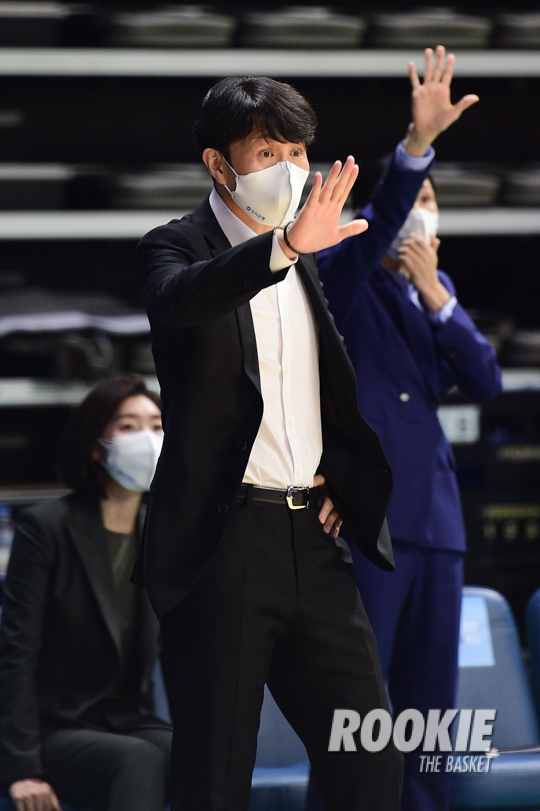 14일 이순신빙상장체육관에서 '삼성생명 2021~2022 여자프로농구’ 아산 우리은행과 청주 KB스타즈의 챔피언결정전 3차전 경기가 열렸다. 우리은행 위성우 감독이 선수들을 격려하고 있다.