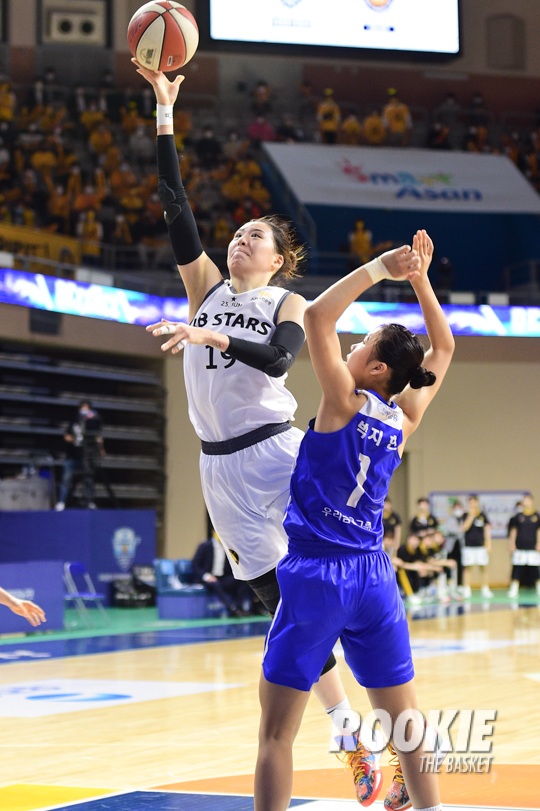 하지만 KB스타즈는 2쿼터붜 힘을 냈다. 박지수가 힘을 내며 골밑 득점을 올렸고 허예은의 3점슛과 속공이 연달아 나오며 차츰 점수차를 벌리기 시작했다. 여기에 쿼터 후반에는 김민정과 강이슬의 득점까지 더해지며 42-36으로 앞선 채 전반을 끝냈다.