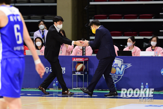 14일 이순신빙상장체육관에서 '삼성생명 2021~2022 여자프로농구’ 아산 우리은행과 청주 KB스타즈의 챔피언결정전 3차전 경기가 열렸다. KB스타즈가 78:60으로 챔피언결정전 3연승으로 우승을 차지하였다. 경기를 마치고 우리은행 위성우 감독이 KB스타즈 김완수 감독에게 축하의 인사를 전하고 있다.