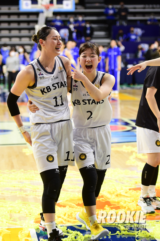 14일 이순신빙상장체육관에서 '삼성생명 2021~2022 여자프로농구’ 아산 우리은행과 청주 KB스타즈의 챔피언결정전 3차전 경기가 열렸다. KB스타즈가 78:60으로 챔피언결정전 3연승으로 우승을 차지하였다. KB 강이슬과 허예은이 기뻐하고 있다.