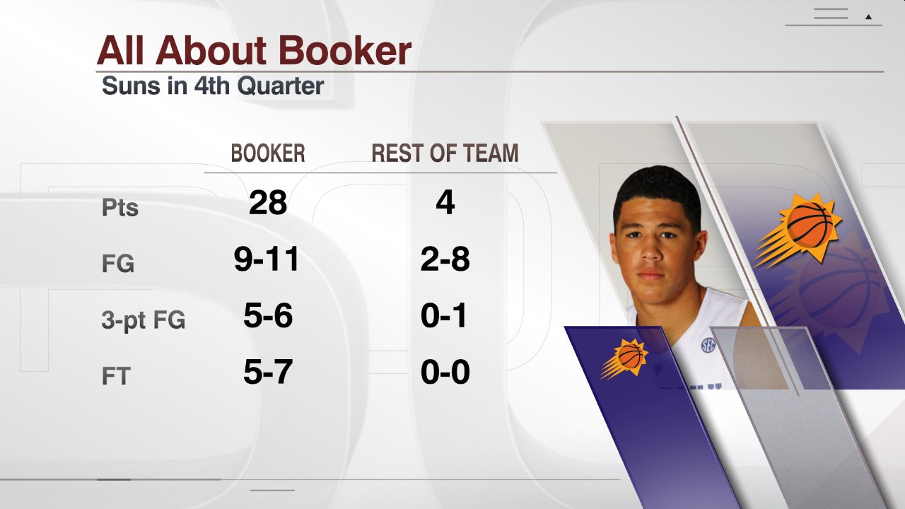 가장 놀라운 것은 4쿼터 활약이었다. 부커는 홀로 11개의 슛 중 9개를 꽂아넣는 등 무려 28점(3점슛 5개)을 쓸어담았다. 이는 아이재아 토마스(29점)의 뒤를 이어 이번 시즌 4쿼터 최다득점 2위에 해당하는 기록이었다. 부커의 득점은 대부분 개인능력에 의해 나왔다는 점에서 더 놀라웠다.