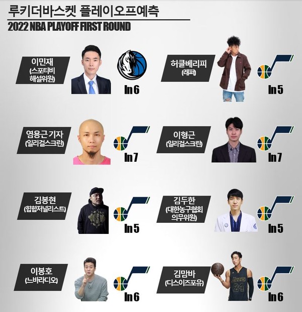 이민재 스포티비 해설위원, 김두한 대한농구협회 의무위원을 비롯해 지난해에도 참여했던 래퍼 허클베리피, '일리걸스크린'의 염용근 기자, '디스이즈포유'의 김맘바, '느바라디오'의 이봉호 등 다양한 현직 NBA 유튜버들도 플레이오프 프리뷰에 함께 하기로 했다.