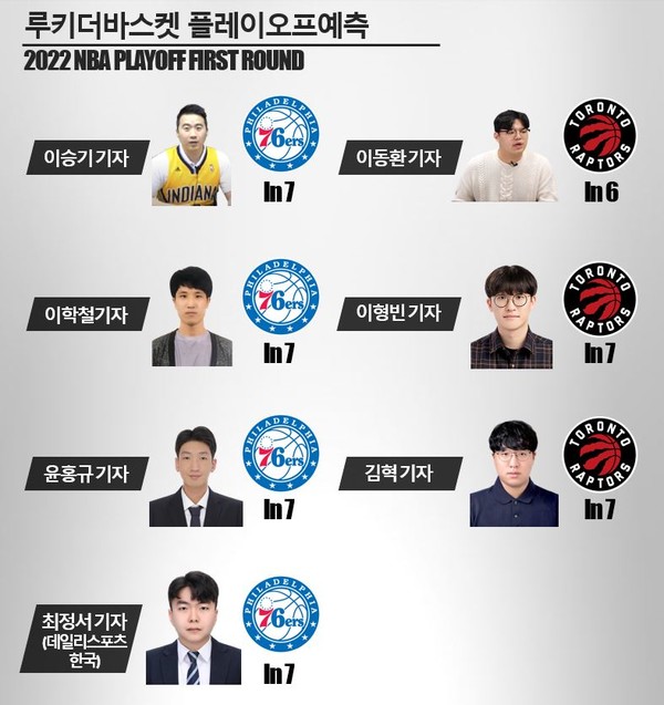예상이 정말 어려운 시리즈다. 필라델피아가 힘으로 토론토를 누르는 그림, 토론토가 벌떼농구를 앞세워 필라델피아를 잡아내는 그림 모두 충분히 상상이 가능하다. 이 시리즈 예상은 패널들이 어느 포인트에 무게를 두느냐에 따라 크게 달라지지 않을까 싶다.