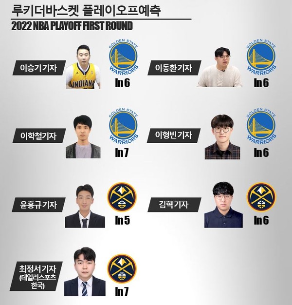 스테픈 커리가 언제 복귀하느냐, 또 컨디션은 얼마나 끌어올릴 수 있느냐에 따라 시리즈 양상이 달라질 것으로 보인다. 현재까지 알려진 소식으로는 커리는 1차전 복귀를 노리고 있다. 다만 컨디션은 100%가 아닌 상황. 덴버 역시 니콜라 요키치의 기복 없는 경기력이 상당히 매서운 팀이다. 7차전 접전 승부를 예상한다.