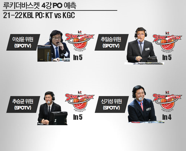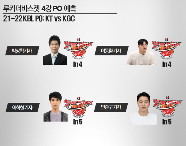 KT와 KGC의 4강 시리즈가 21일부터 본격적으로 시작된다. SK와 오리온의 시리즈와는 달리 패널들 대부분이 상당히 치열한 승부를 내다봤다. 5차전까지 시리즈가 흘러갈 것이라 예상한 패널도 다수다. 그러나 모두가 결국 최종 승자는 KT가 될 것이라 전망했다.