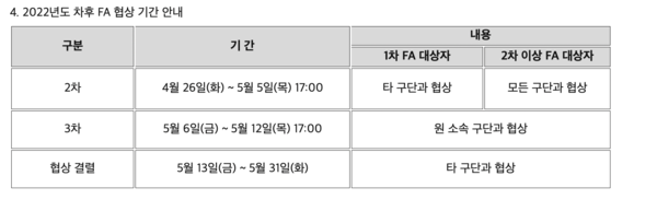 26일부터 오는 5월 5일 오후 5시까지는 2차 협상이 진행된다. 이 기간 중 1차 FA 대상자 중 미계약자(김연희, 한엄지)는 타구단과 협상을 가지게 되고, 2차 이상 FA 대상자는 모든 구단과 협상을 가질 예정이다.