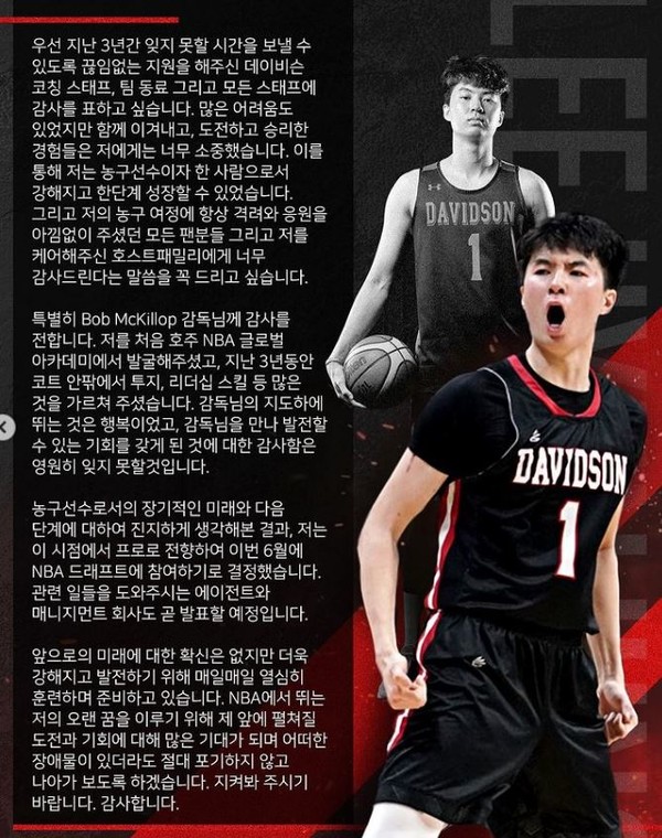 데이비슨 대학 3학년인 이현중은 NBA 드래프트에 나서기 위해서 오는 25일까지 얼리 엔트리 참가를 선언했어야 하는 상황. 그리고 이현중은 데이비슨에서 4학년 시즌을 보내는 대신 조기에 NBA 드래프트에 도전하기로 했다.