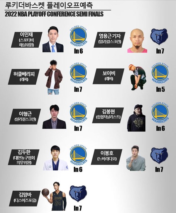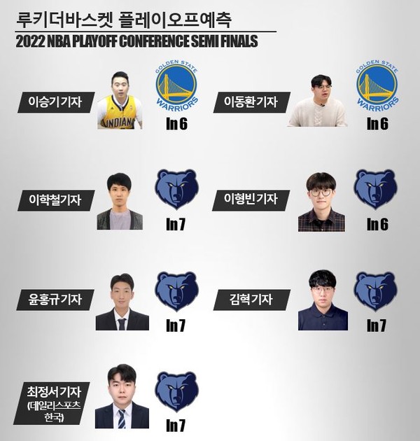 멤피스는 안드레 이궈달라의 존재 탓에 골든스테이트를 만나면 의지가 불타오르는 팀이다. 이번 시리즈 또한 이궈달라와 멤피스의 관계 덕분에 흥미를 끄는 요소가 많다. 관건은 골든스테이트가 미네소타처럼 자 모란트를 효과적으로 봉쇄할 수 있느냐가 될 전망. 7차전까지 가는 혈투가 예상되는 가운데 멤피스가 신승을 따내리라 예상해본다.