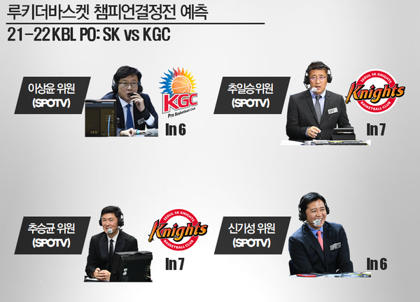 SK는 오리온을 상대로 생각보다 고전을 하긴 했지만 어쨌든 일찍 시리즈를 끝낸 후 챔프전에 대비할 충분한 시간을 가졌다. 거기다 SK가 홈에서 1차전과 2차전을 치른다는 점도 유리하게 작용할 수 있다. 두 팀의 객관적인 전력이 상당히 엇비슷하기 때문에 시리즈 초반 우위를 가져가는 것이 중요한데, 그런 점에서 홈 이점이 있는 SK가 다소 유리하다고 본다. SK의 6차전 승리를 전망한다.