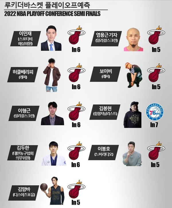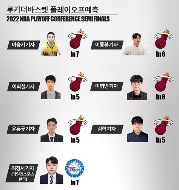 조엘 엠비드의 시리즈 초반 결장이 필라델피아에 분명 큰 타격이 될 것이다. 마이애미도 카일 라우리의 결장 변수를 안고 있긴 하다. 하지만 마이애미가 1라운드에서 보여준 수비력을 감안하면 엠비드가 빠진 필라델피아의 공격을 제어하는 것이 어렵진 않을 것이다. 마이애미가 풍부한 외곽 물량과 강력한 스위치 수비로 필라델피아를 막아낼 것이다. 마이애미의 6차전 시리즈 승리를 예상한다.