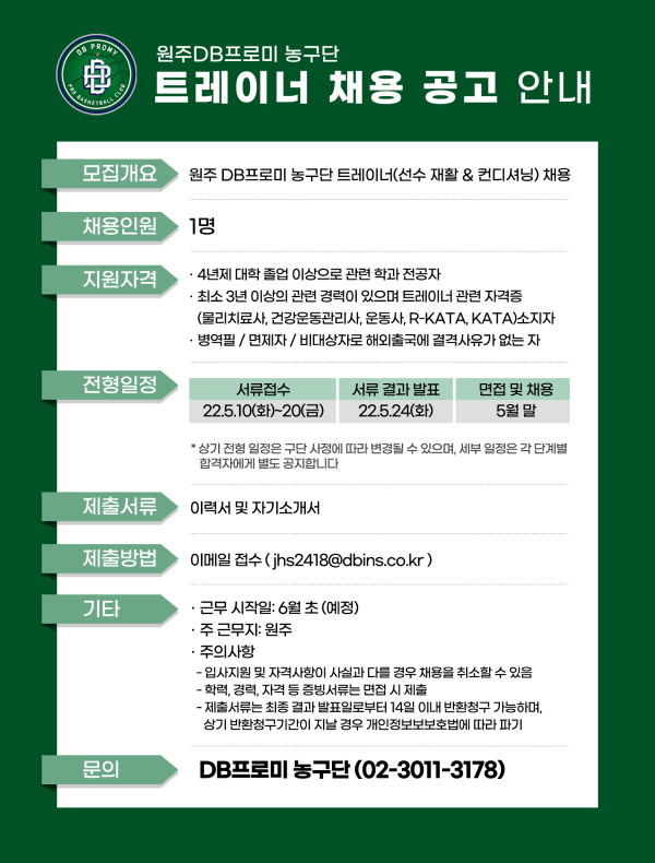 원주 DB 프로미가 트레이너를 공개 채용한다.
