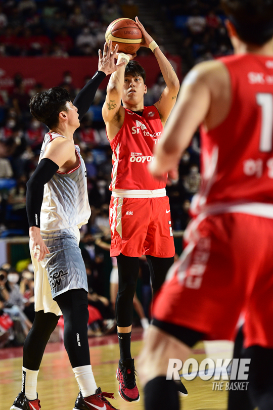 10일 잠실학생체육관에서 '2021-22 KGC인삼공사 정관장 프로농구’ 서울 SK나이츠와 안양 KGC인삼공사의 챔피언결정전 5차전 경기가 열렸다. SK나이츠 최준용이 3점슛을 시도하고 있다.