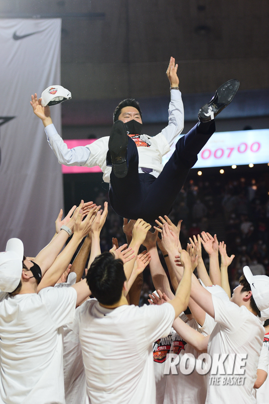 전희철 감독은 “안 우려고 했는데 이상하게 눈물이 났다. 선수 때도 우승을 했을 때 울었는데 오늘은 여러 생각이 주마등처럼 지나가면서 눈물이 난 것 같다. 원래 눈물이 많은 편은 아닌데 50대가 되면서 이상해졌다. 마음이 많이 여려진 것 같다”며 함박웃음을 지었다.