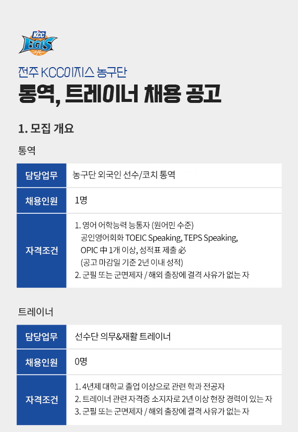 전주 KCC 이지스가 선수단 트레이너와 외국선수 통역 담당자를 모집한다.