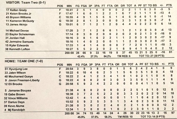 '팀1(TEAM ONE)'에 배정된 이현중은 이날 엘리 브룩스, 제일런 윌슨 등과 한께 주전 포워드로 경기에 나서 20분 54초 동안 코트를 누볐다.