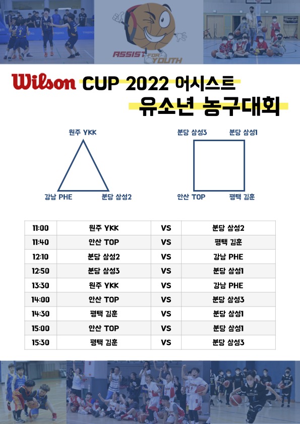 어포유 프로젝트의 본격적인 첫 발걸음이 될 이번 대회에는 멤버십 가입 농구교실 중 총 7팀(원주 YKK, 안산 TOP, 평택 김훈, 강남 PHE, 분당 삼성 1,2,3)이 참가해 초등학교 5학년부 대회로 하루 동안 즐거운 경쟁을 펼칠 예정이다. 두 개조로 나눠질 참가 팀이 홀수이기 때문에 어시스트는 3조가 묶일 A조의 경기는 전, 후반 15분, 4개 조의 B조는 각 10분으로 운영해 참가 팀의 경기 시간이 동일할 수 있도록 했다.