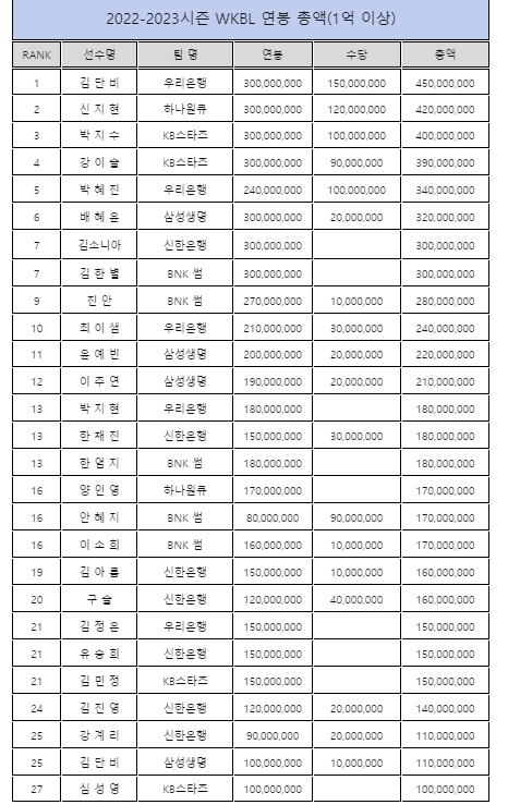 WKBL 선수 연봉 상한선인 3억 원을 받는 선수는 지난 시즌보다 1명 늘어난 7명으로 집계됐다. 신지현(하나원큐)은 데뷔 이후 처음으로 연봉 3억 원을 받게 됐다.