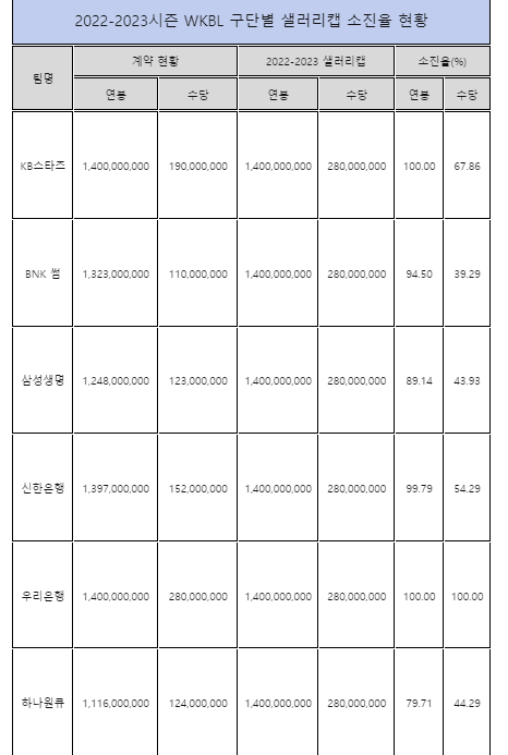 구단별 평균 샐러리캡 소진율은 연봉부문 93.86%, 수당부문 58.27%를 기록했다. 우리은행은 연봉과 수당 샐러리캡 모두 100% 소진했으며, 하나원큐는 연봉 부문에서 가장 낮은 79.71%, BNK 썸은 수당 부문에서 가장 낮은 39.29%의 소진율을 보였다.