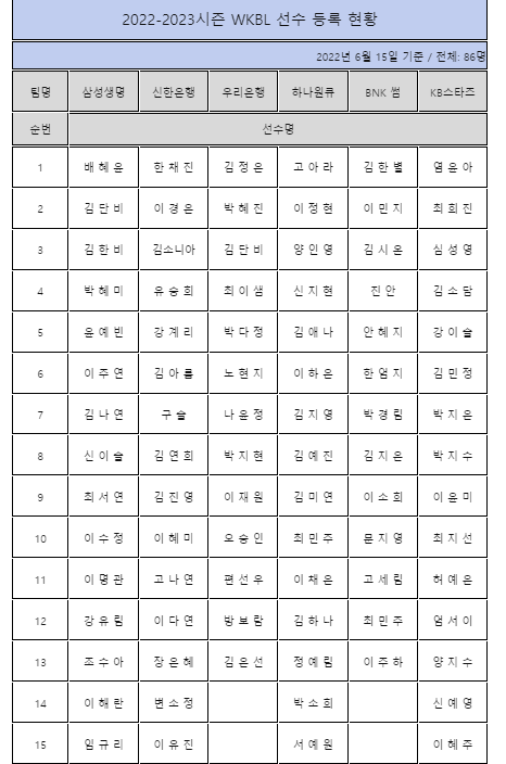 WKBL은 15일(수) 17시 2022~2023 여자프로농구 선수 등록을 마감했다.