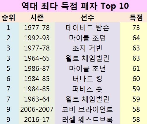 오클라호마시티의 슈퍼스타 러셀 웨스트브룩(28, 191cm)은 무려 58점을 쏟아내고도 끝내 웃지 못했다. 그렇다면 리그 역사상 패한 선수 중 최다 득점 기록자는 누구일까.