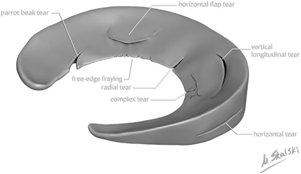 반월 연골판 파열은 상당히 다양한 형태로 발생합니다. 아래 그림처럼 아주 다양한 패턴으로 파열될 수 있기 때문에 MRI나 관절경을 하지 않고서는 예측이 불가능합니다.