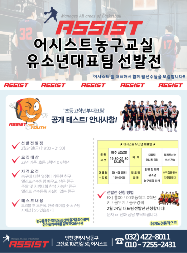 어시스트는 오는 24일 인천광역시 남동구에 위치한 어시스트 체육관에서 '어시스트 농구교실 유소년 대표팀 선발전'을 개최한다.