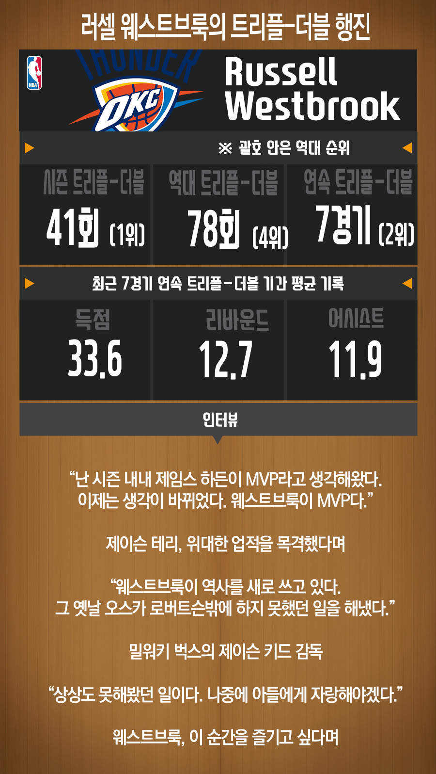 이날 웨스트브룩의 41호 트리플-더블 활약상을 간단한 숫자와 함께 돌아보았다.
