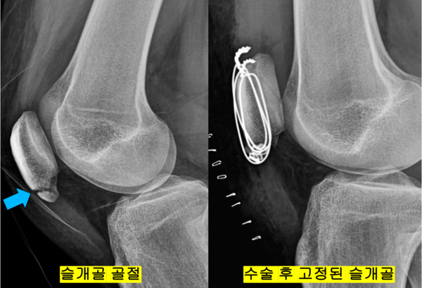 A. 슬개골 골절 부상은 슬개건의 파열이 아니라 슬개골이 파열되는 부상입니다. 넘어질 때 슬개골에 직접적인 충격이 실려 골절이 발생하는 경우가 가장 흔하지만, 운동선수들의 경우 순간적으로 대퇴대퇴사두근이 수축할 때, 큰 부하가 건에 전해지지 않고 슬개골에 전해질 경우 발생할 수 있습니다. 이때는 뼈가 부셔지는 골절이 발생할 수 있습니다. 그러나 슬개골 부상의 경우에는 건부상에 비해 조금 더 좋은 결과를 기대할 수 있습니다. 골절의 경우에는 수술로 뼈의 완전한 유합을 얻게 되면 재발없이 “완치"가 가능할 수 있기 때문입니다.