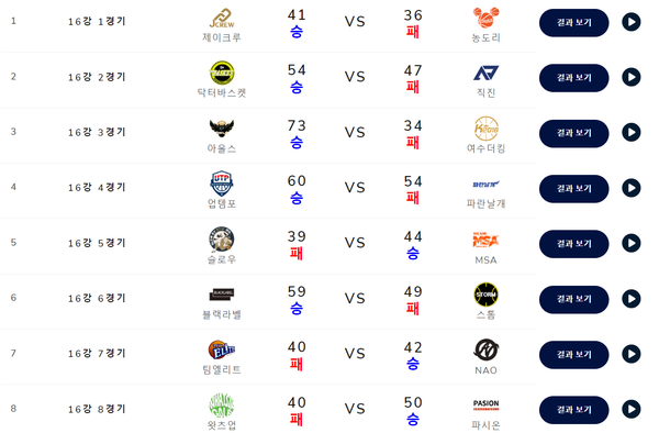 16강 첫 경기에선 이강호(15점, 4어시스트), 정흥주(10점, 4리바운드), 서창현(10점, 2리바운드) 3명의 선수가 두 자릿수 득점을 기록한 제이크루가 허경부(17점, 5리바운드)가 분전한 농도리의 거센 추격을 41-36으로 따돌리고 가장 먼저 8강에 올랐다. 제이크루는 3쿼터 농도리의 득점을 단 2점으로 막은 것이 승리의 요인이 됐다.