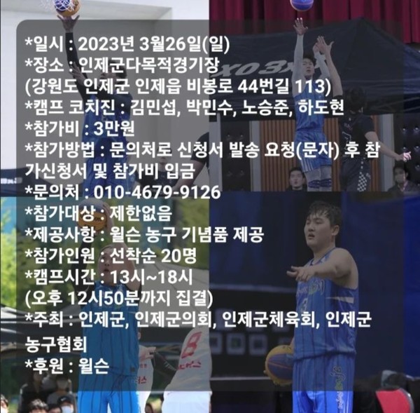 지난해 열린 첫 번째 캠프를 통해 청소년들과 즐거운 시간을 보낸 하늘내린인제는 2023시즌 개막을 앞두고 두 번째 캠프를 개최, 3x3 홍보와 함께 인제군 농구 발전을 위한 시간을 마련하게 됐다.
