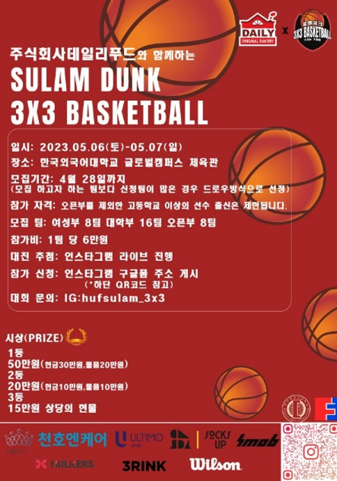 ‘3 on 3 FREESTYLE HUFSKETBALL (2016)’ , ‘3 on 3 W-HUFSKETBALL (2019)’ 등 생활 스포츠로서의 농구 활성화와 농구의 인기 제고를 위해 농구 이벤트 역시 개최한 경험이 있는 한국외대 글로벌스포츠산업학부는 올해 개봉한 슬램덩크 열풍에 힘입어 슬램덩크 콘셉트의 대회인 ‘2023 데일리 푸드와 함께하는 설렘덩크 3X3 : 외대는 거들 뿐’을 개최한다.