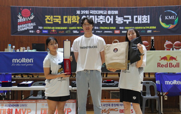 지난 9일 국민대학교 체육관에서 열린 제 39회 국민대학교 총장배 전국 대학 아마추어 농구대회가 성료되었다. 여자부 3위에 오른 경기대 이슈가 재치있는 포즈로 기념사진을 촬영하고 있다.
