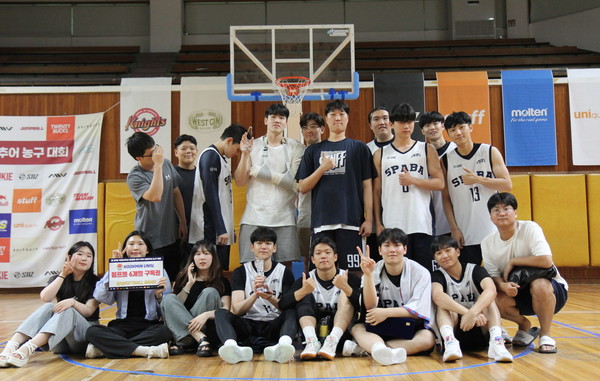 지난 9일 국민대학교 체육관에서 열린 제 39회 국민대학교 총장배 전국 대학 아마추어 농구대회가 성료되었다. 뜨거웠던 열흘간의 모든 일정을 마친 후, 남자부 준우승을 차지한 서울과학기술대 SPABA가 단체사진을 촬영하고 있다.